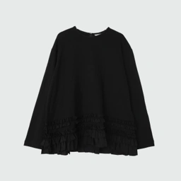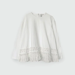 A round neck long sleeve tee with a-line silhouette, adorned with stack of frills along the hemline, used a back invisible zipper opening.
